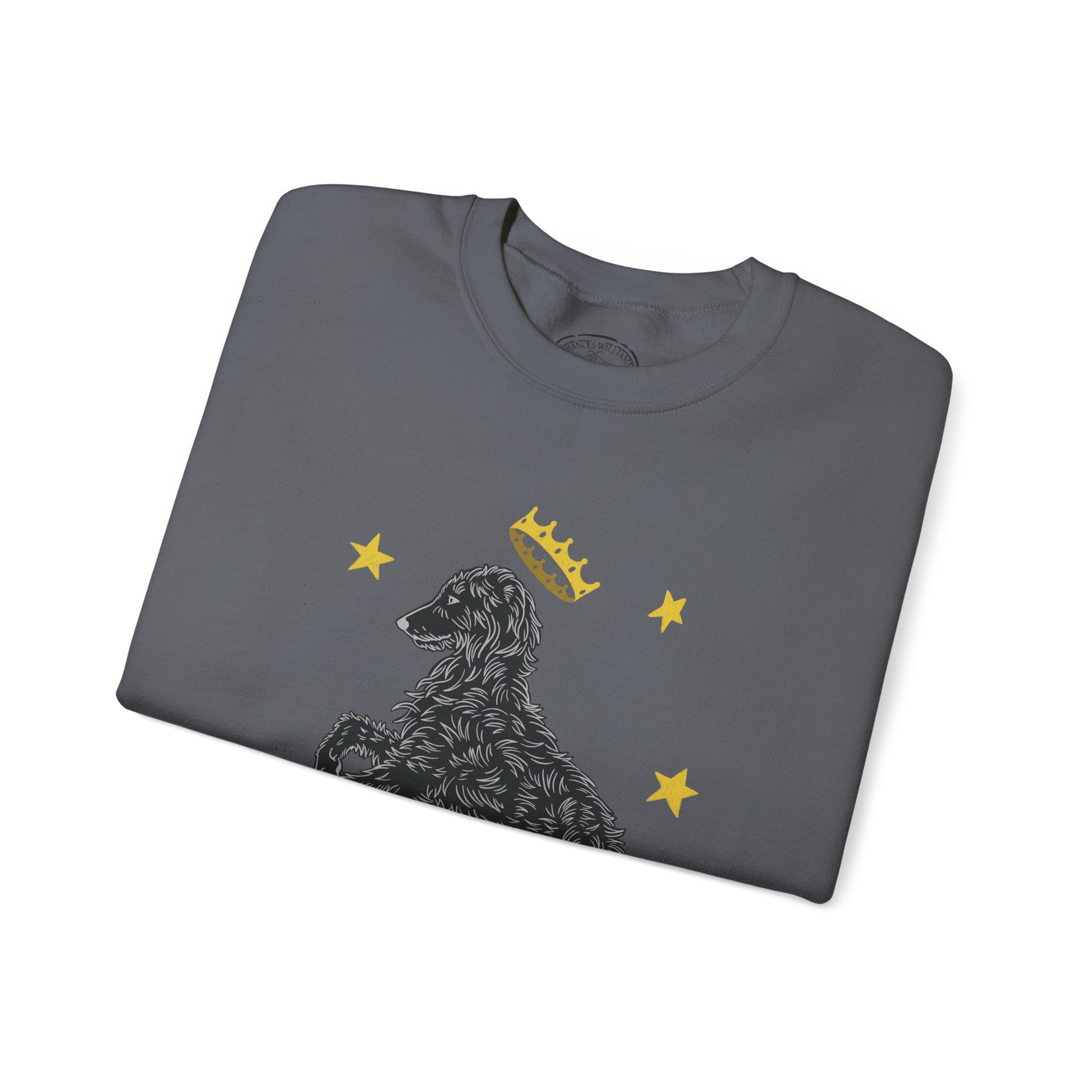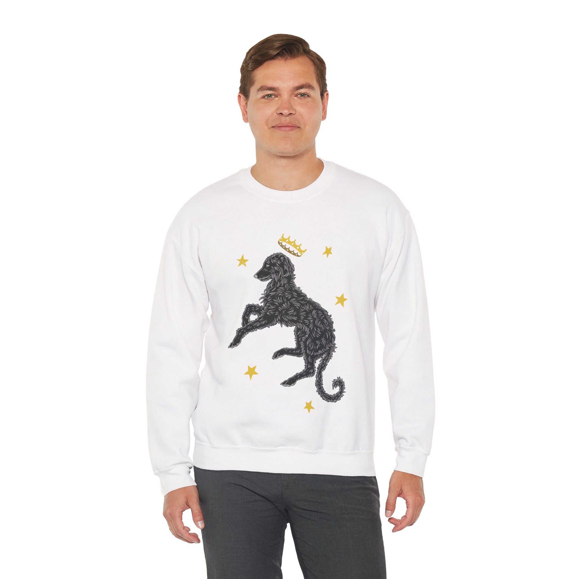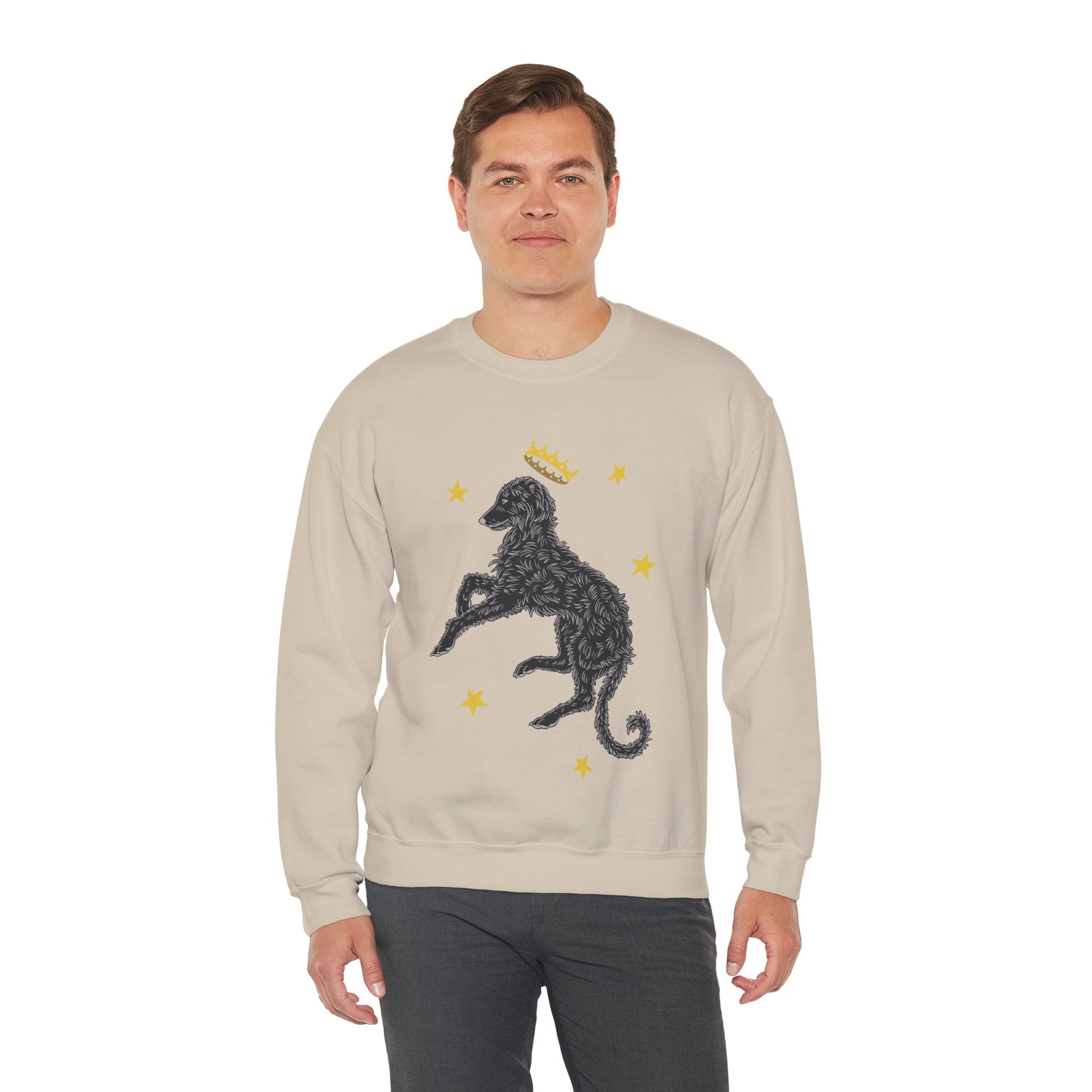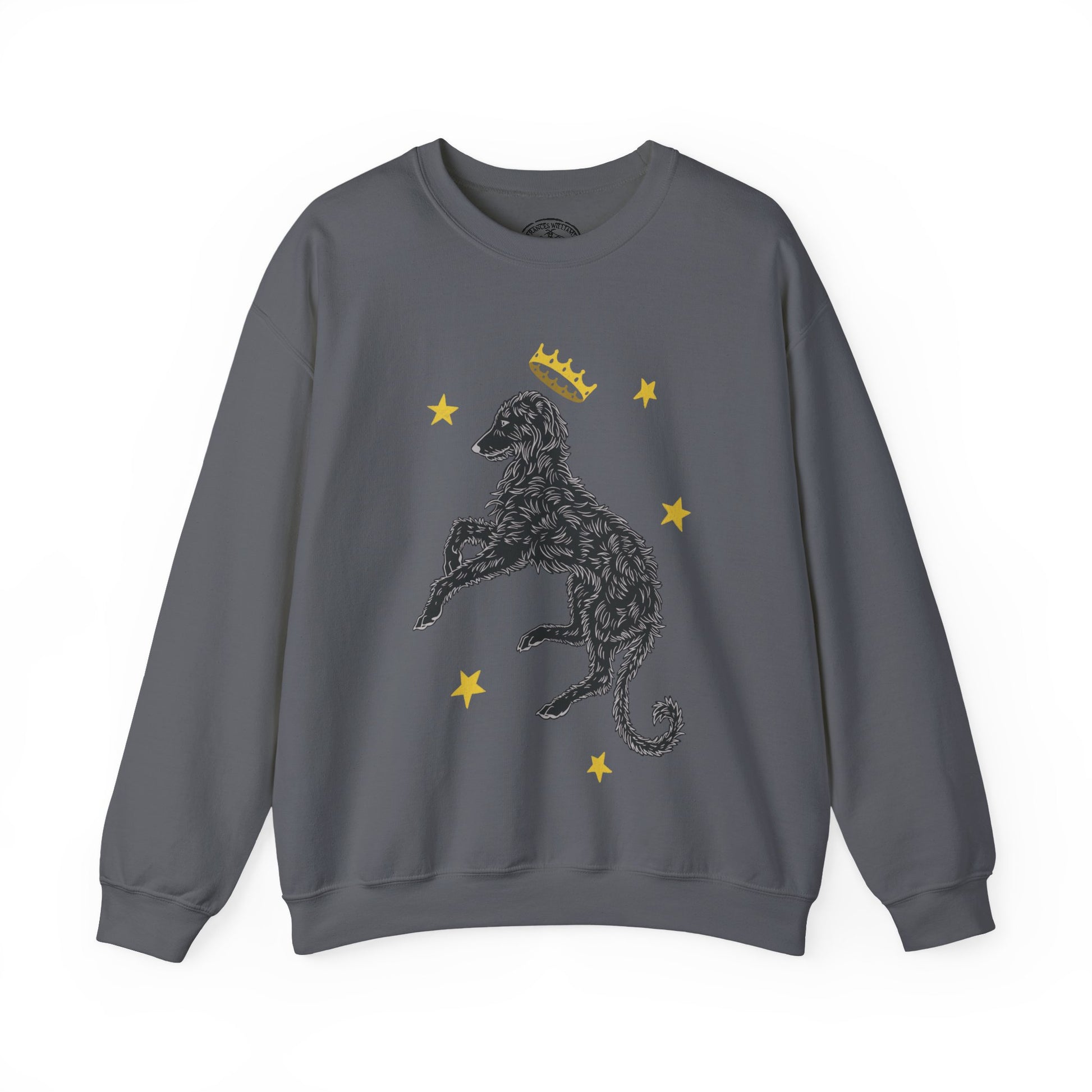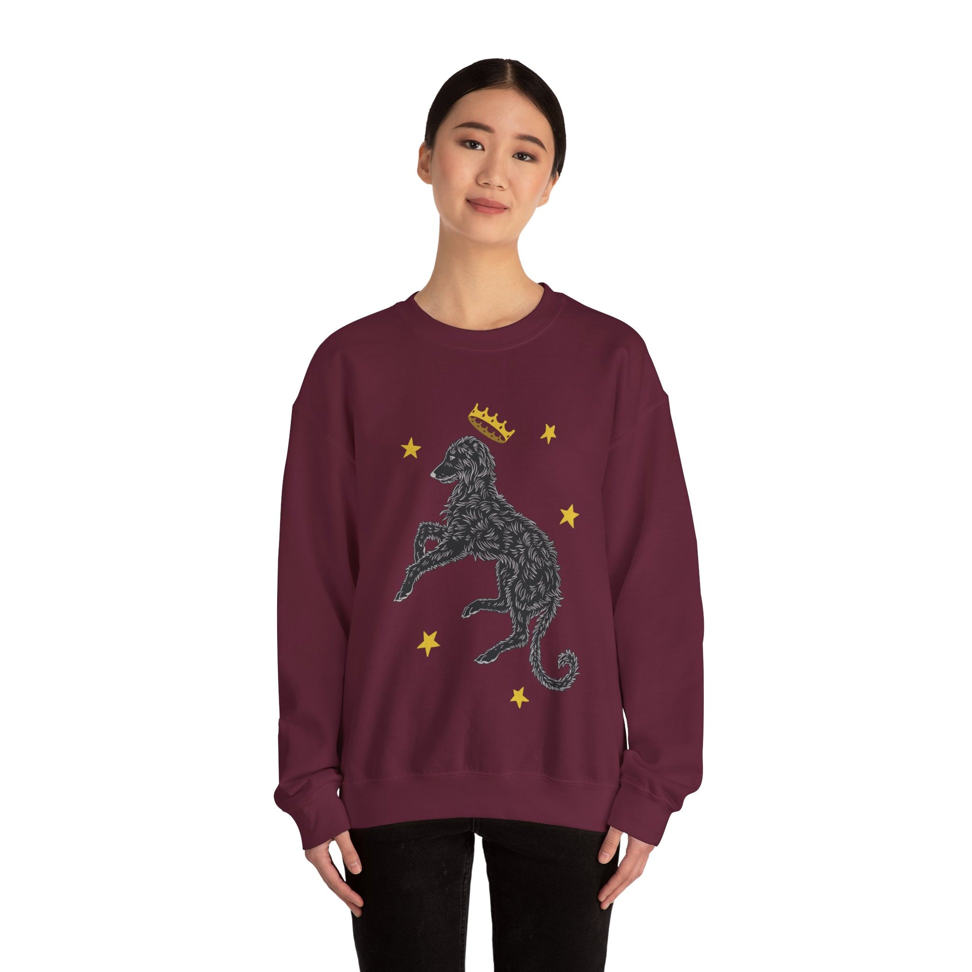 This illustrated Deerhound design was created for the love of a dog who exudes a royal and mystical vibe. A breed that was often seen within great halls or hunting deer through the forests. This comfortable and durable sweatshirt is perfect for those who love to celebrate the elegant and lazy Deerhound.