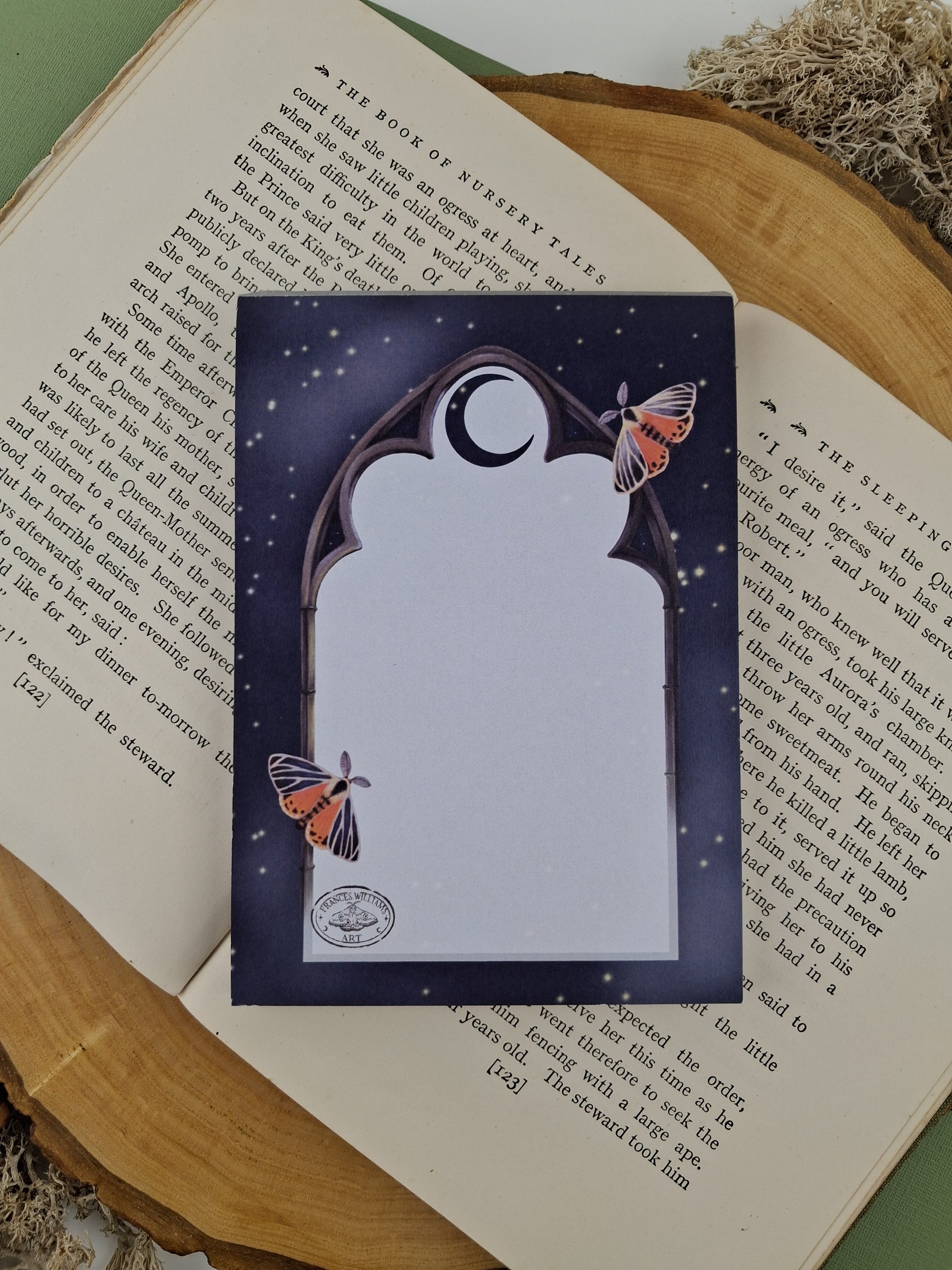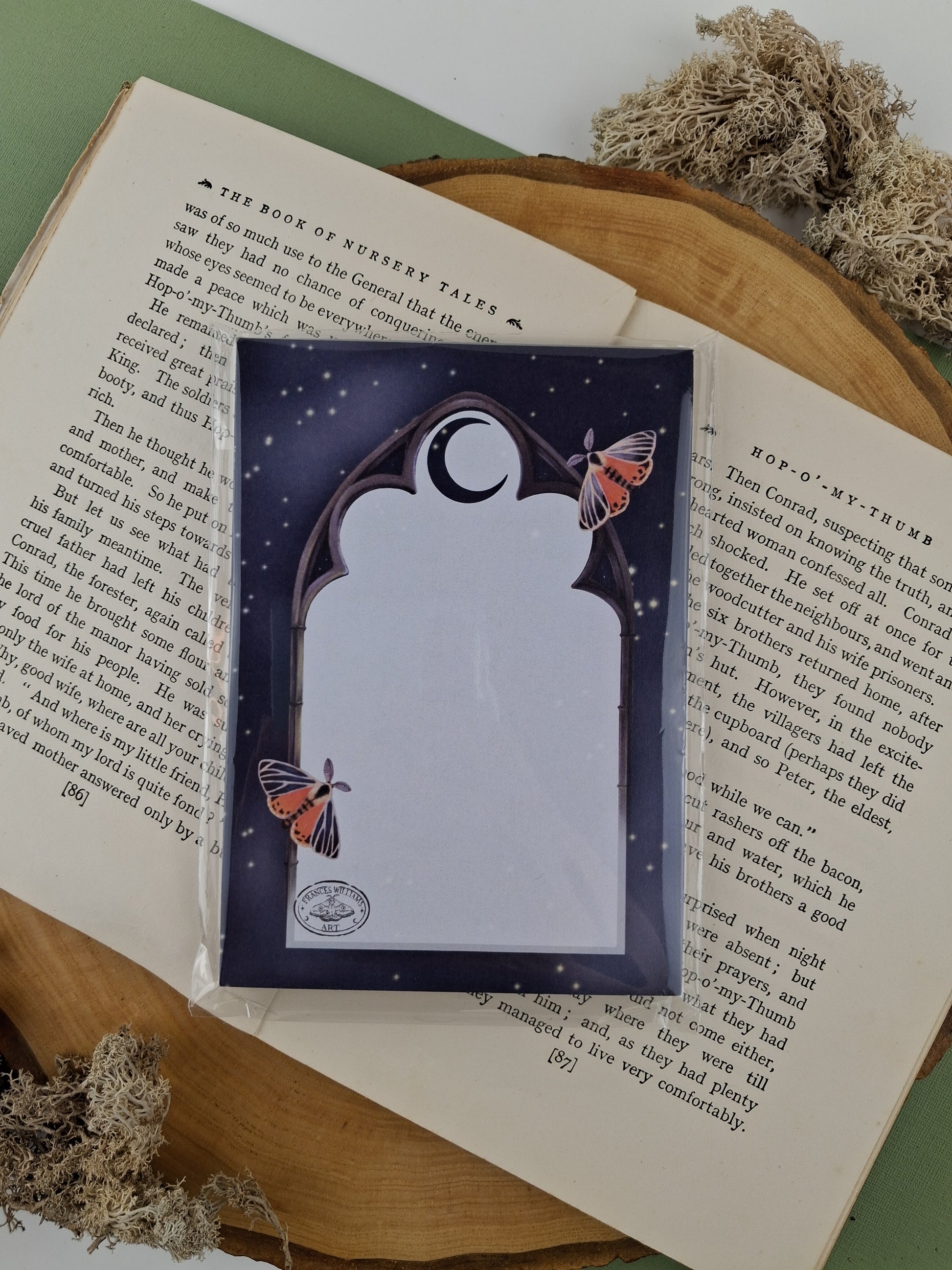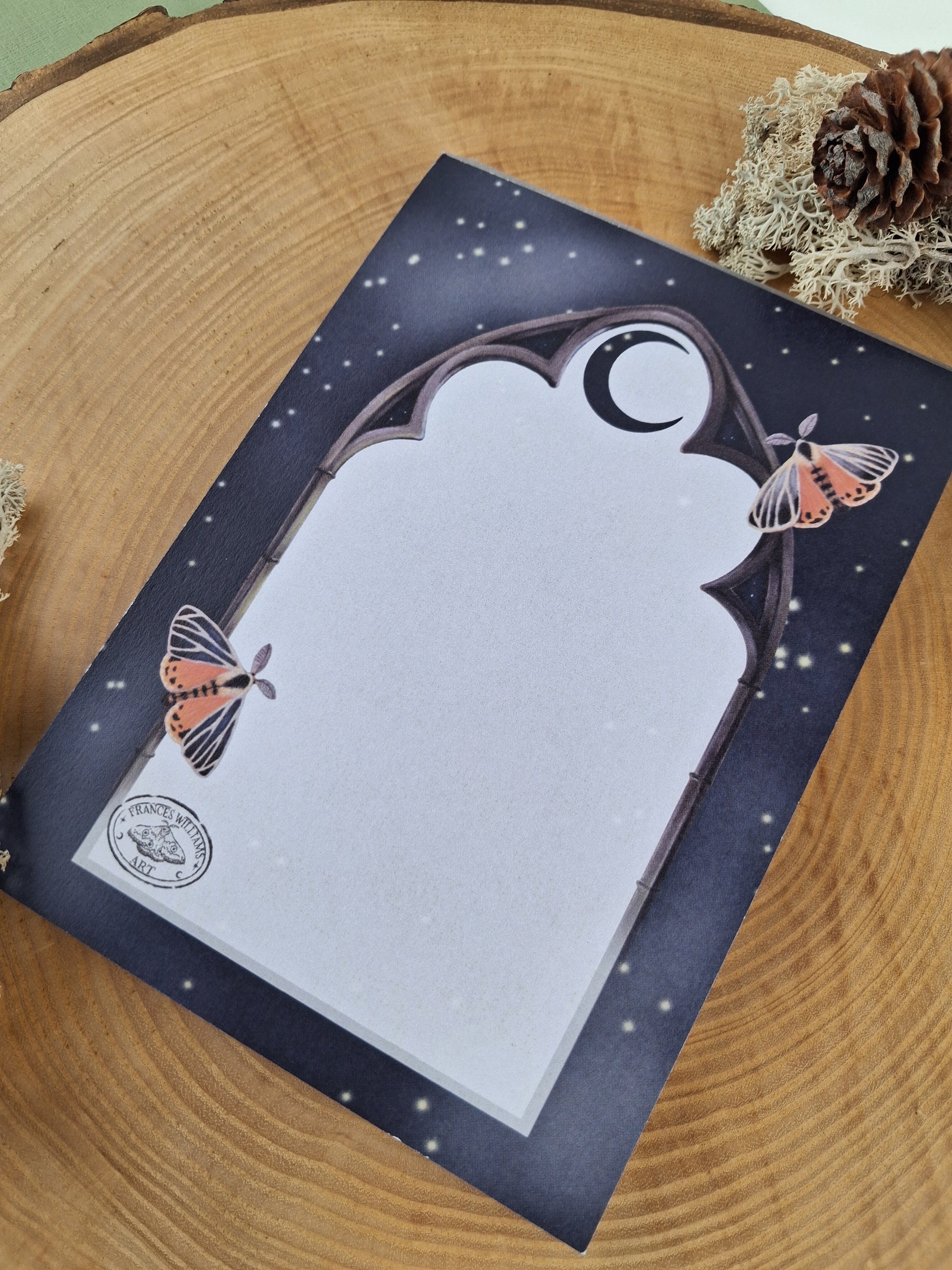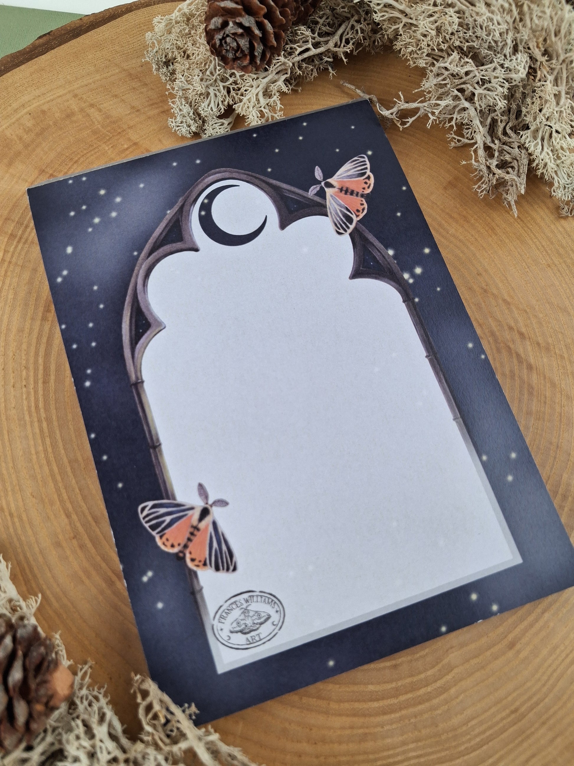 Featuring the gothic window frame and moths from the Midnight Guardian artwork. Set against a starry night sky this is a beautiful and unique little notepad.